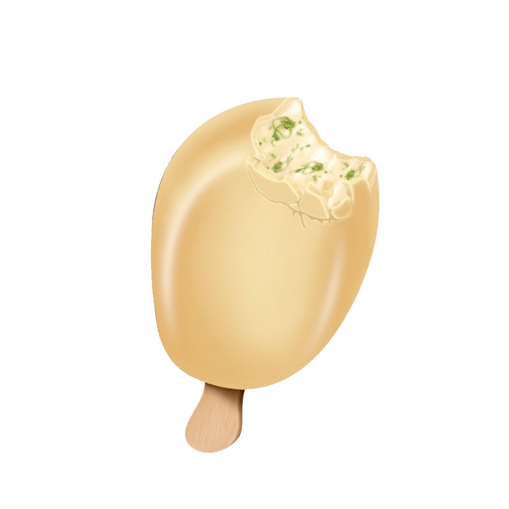 Sorvete sabor torta de limão com raspas de biscoito e cobertura de chocolate branco com raspinhas de limão misturados a cobertura.